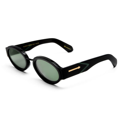 ALL OUT B is a handcrafted, medium oval silhouette for a flattering, fashion-forward fit. The sleek black acetate frame is paired with a contrasting metal nose bridge and iconic metal arrow hardware at the temples. ALL OUT B is a bold, adventurous aesthetic.